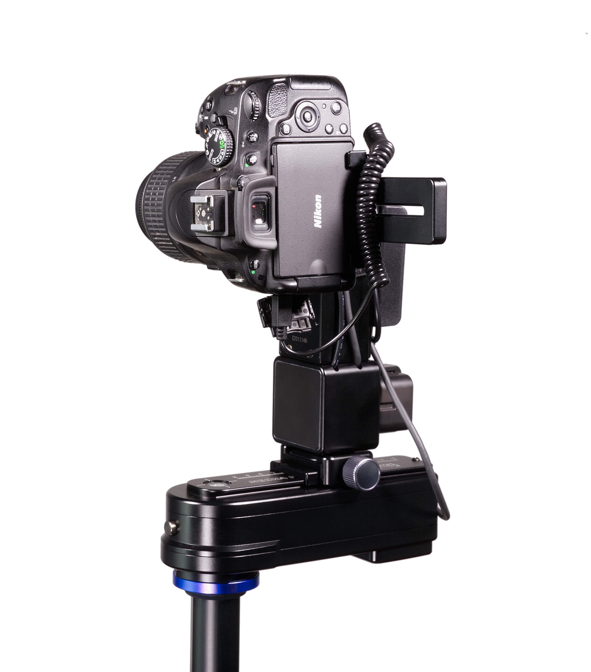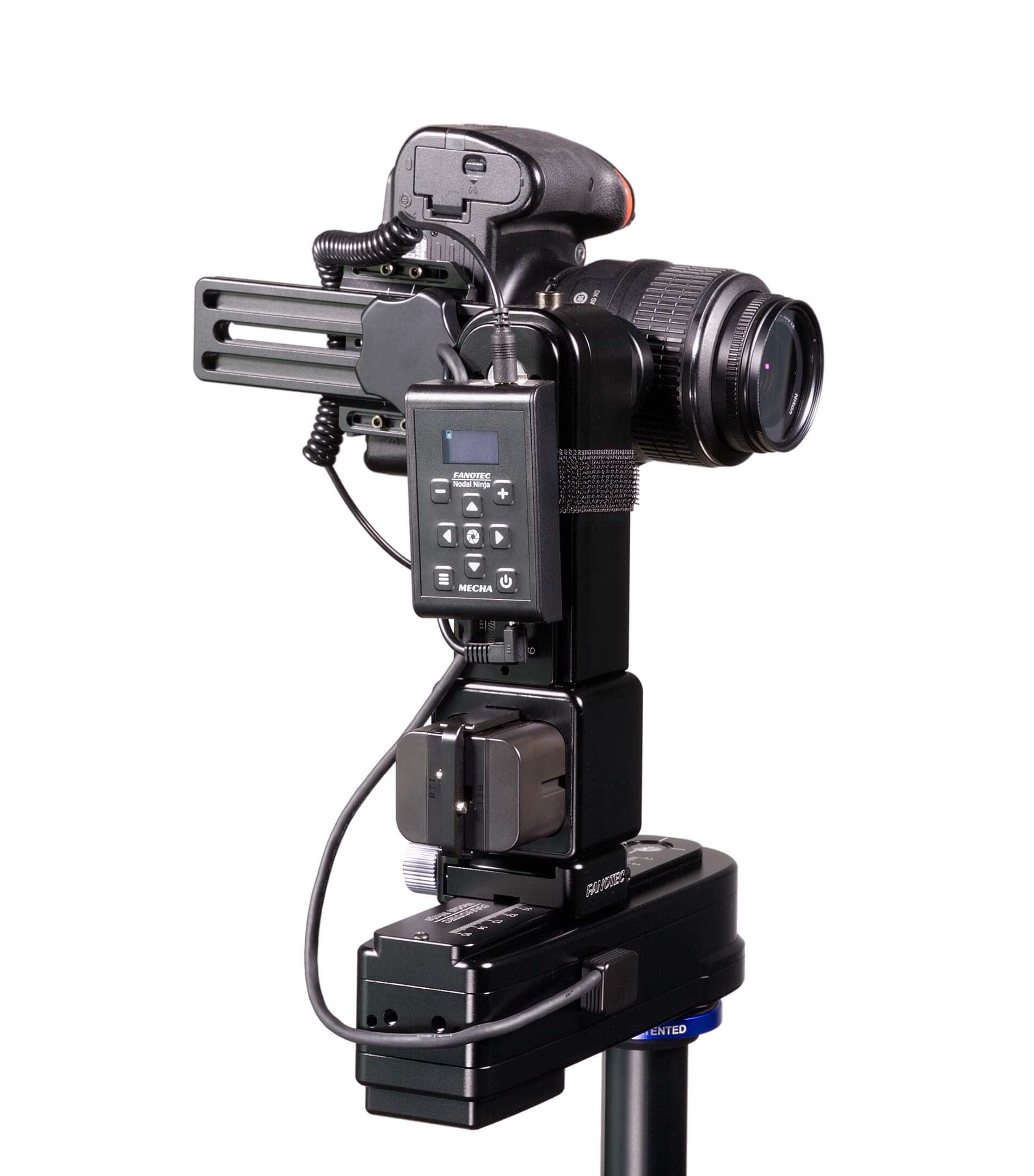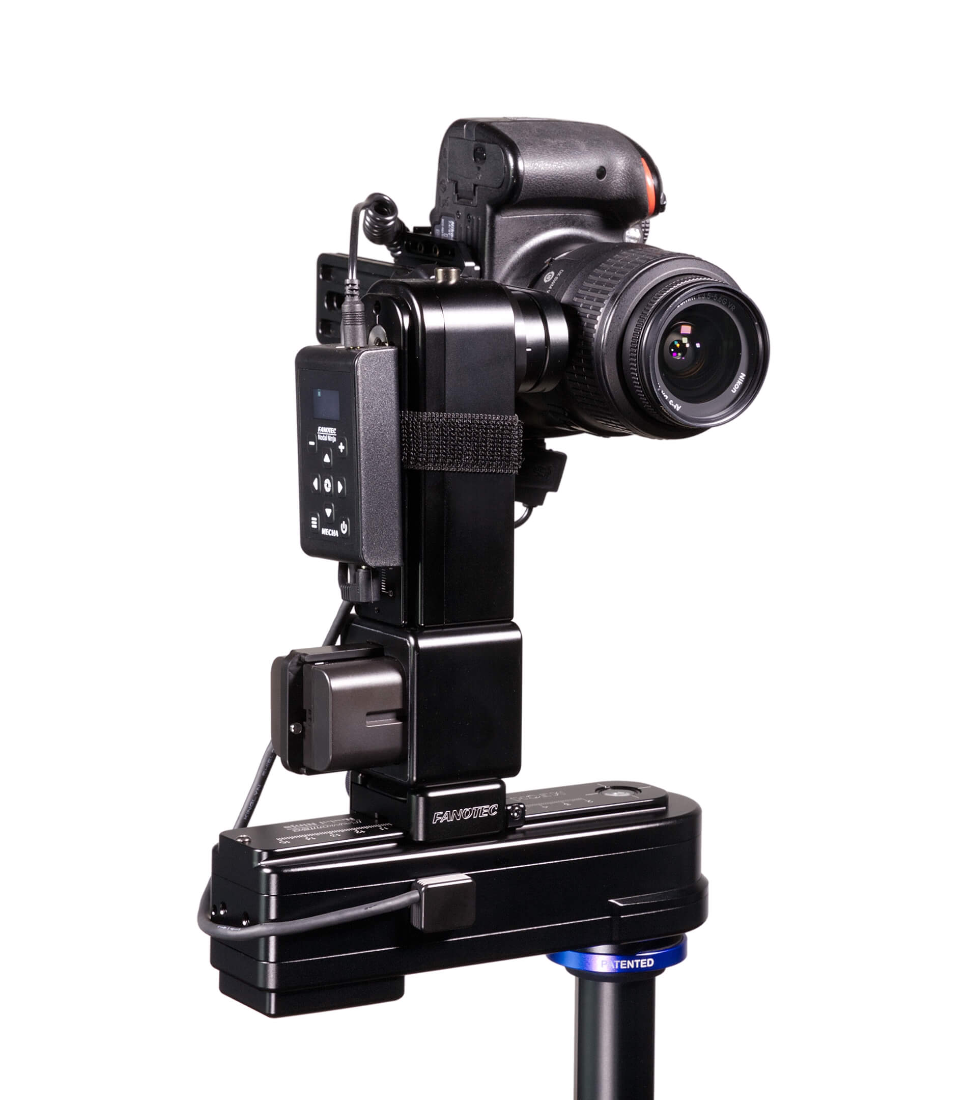 A heavy-duty and affordable dual-axis pan-tilt head solution for full-size DSLRs and lenses. We use some parts from NN6, a MECHA P1 as lower rotator, a MECHA E2 as upper rotator, together with C2 controller and a battery holder which also acts as a vertical extender. The new MECHA P1 rotator has virtually no backlash and is very quiet compared to a MECHA E2 rotator. The only drawback is the extra weight and bulk.