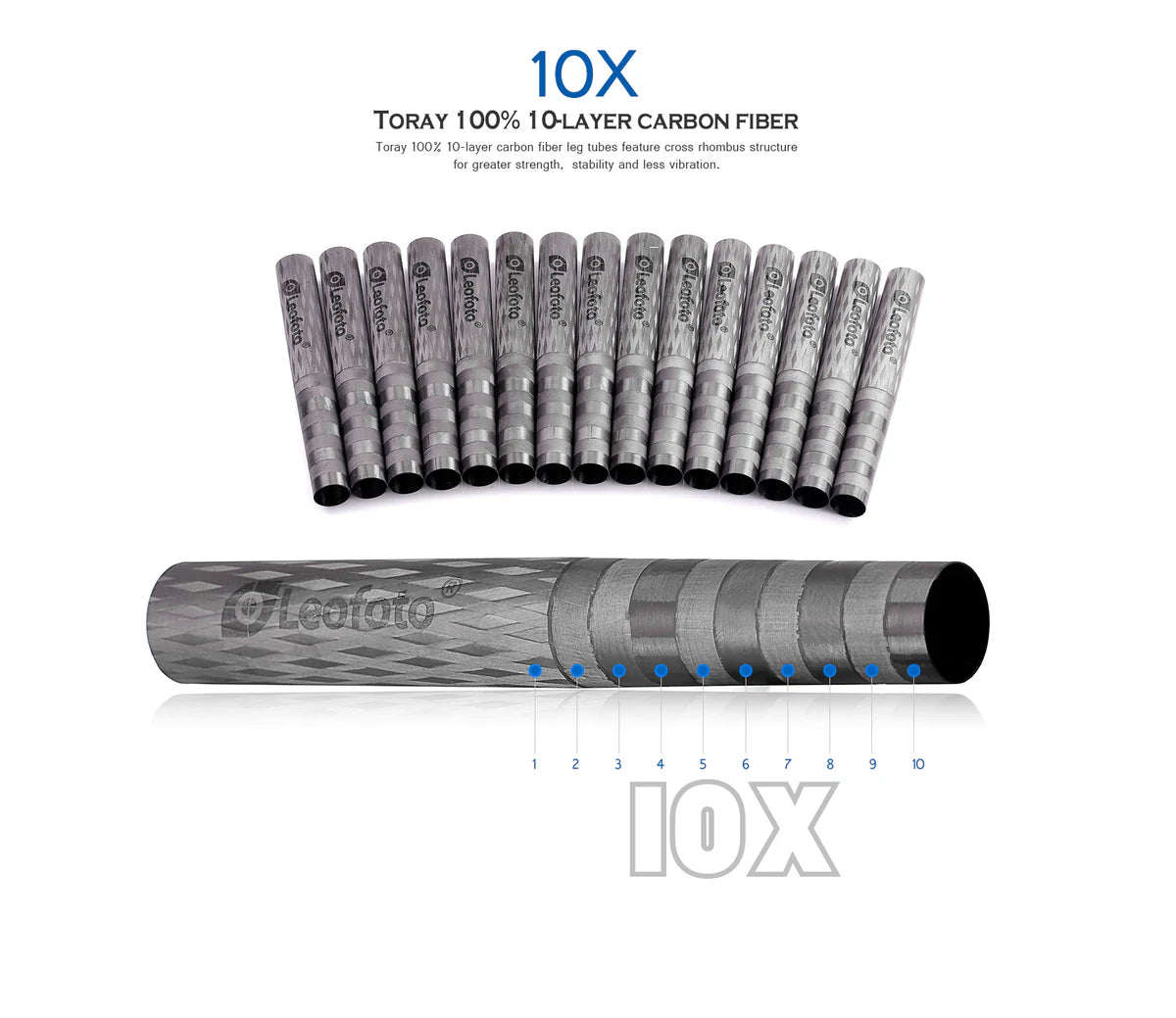Leofoto tripods features 10x carbon fiber tubes that make the tripod lightweight while maintaining a strong load capacity. The 6061 aluminum parts are CNC machined and hard anodized, making the surface tough against scratching and scuffing. The twist leg lock system is quickly deployed with a simple quarter turn. With the tripod's three variable leg angles, it allows you to splay the legs completely out, so the support can drop to a very low minimum height.